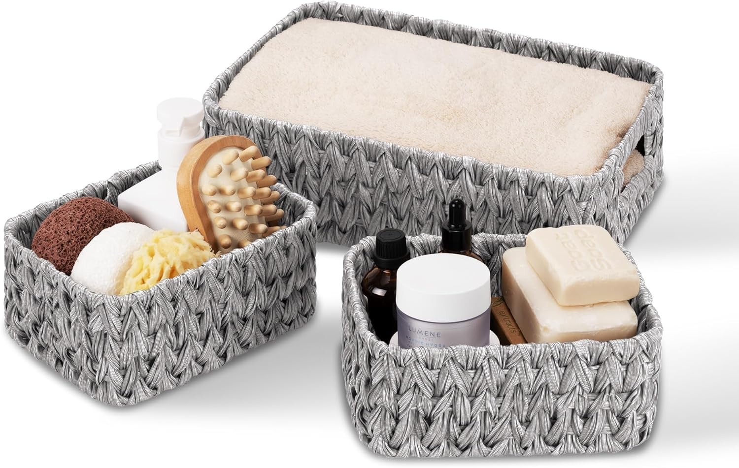 Wicker Storage Baskets, Pack of 3 Wicker Baskets for Storage, 1 Large Wicker Storage Box and 2 Small Wicker Baskets Waterproof, Bathroom Counter
