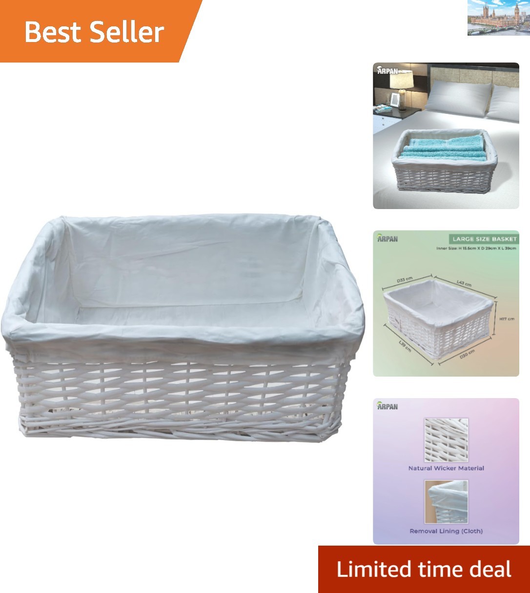 Arpan Large White Wicker Storage & Hamper Basket with White Cloth Lining – Large Baskets for Xmas, Wedding, Confetti & Parties, Snack Basket, Wicker Baskets (Large Pack of 2)
