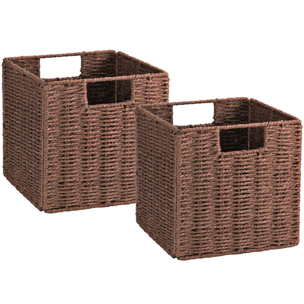 Vagusicc Wicker Baskets, Set of 2 Hand-Woven Paper Rope Foldable Cubby Storage Bins, Large Wicker Storage Basket for Shelves Pantry Organizing & Decor, Brown (11″×11″×11″)