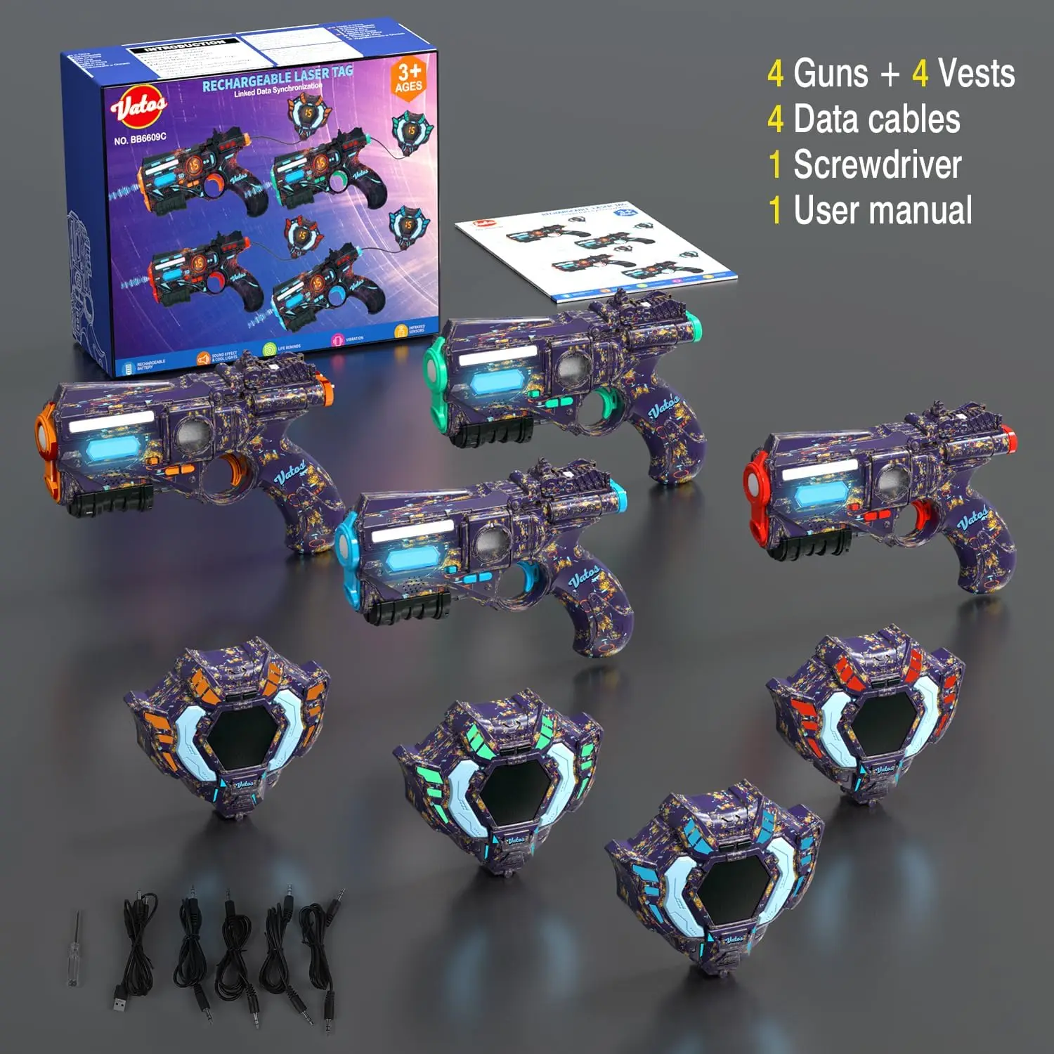 VATOS Rechargeable Laser Tag Guns Set of 4-2.4GHz Data SYNC Display Laser Tag Gun with Vest 4 Players, Infrared Laser Tag Game Indoor & Outdoor Play for Kids Boys Girls Teen Age 6-12+ Years Old