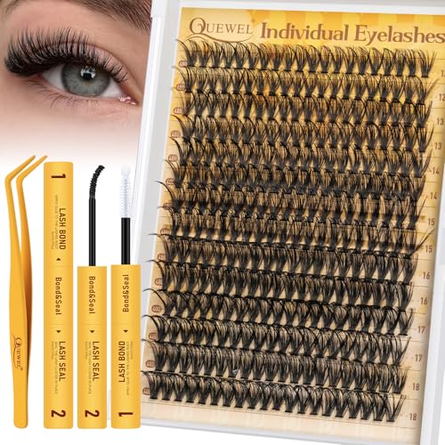 QUEWEL Individual-Eyelashes Kit 280Pcs Cluster Lashes Kit, DIY Lash Extension D Curl Lashes Individual Cluster with Lash Bond and Seal and Lash Tweezers (DJ-40D KIT)