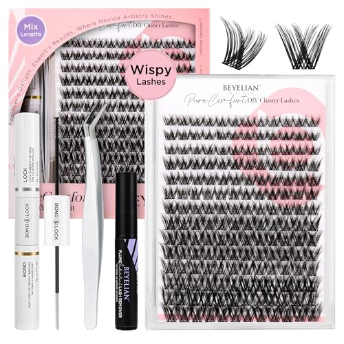 BEYELIAN Lashes Clusters Kit, Lash Extension Kit with Wispy Cluster Lashes, Lash Bond and Seal, Lash Remover, Lash Applicator, Natural Reusable Individual Lashes Kit 10-16mm (D62)