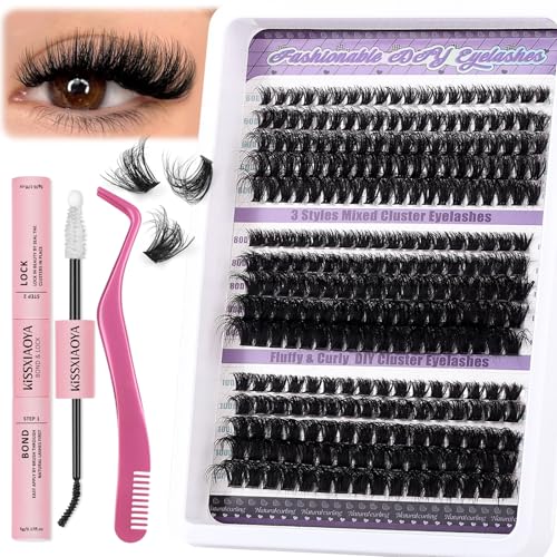 EYDEVRO Fluffy Cluster Lashes Kit D Curl Individual Lashes Thick Volume Lash Extension Kit DIY Eyelash Extension Kit Lashes Individual Cluster Lash Bond and Seal Lash Tweezers (8-16mm, D Curl)