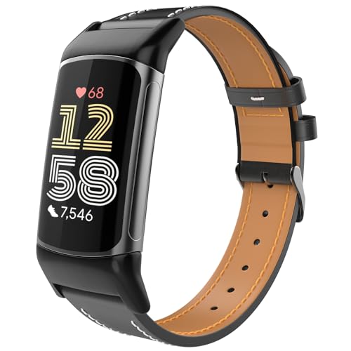 TiMOVO Leather Strap Compatible with Fitbit Charge 6/Fitbit Charge 5 Watch Bands, Top Grain Genuine Classic Leather Replacement Wristbands Straps for Women Men, Black