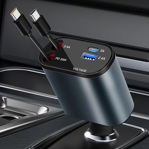 AXFEE USB Car Charger Adaptor, Type C Cable 4 in 1 Fast Car Charge, Retractable Cable Compatible with iPhone 15 Galaxy S23/S22,Google/Huawei, Type C Smartphones, Charger with 2 Port