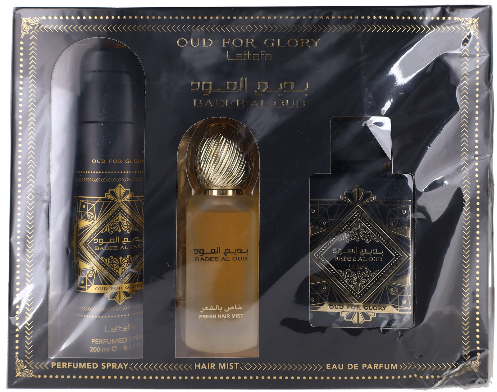 Oud for Glory by Lattafa Unisex Set: EDP+Hair Mist+Perfumed Deo 3.4+1.7+6.7oz DB