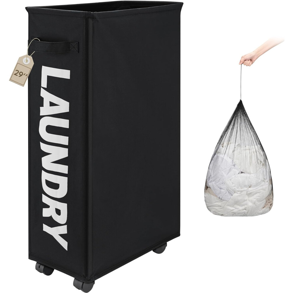 DOKEHOM 29-Inches Enlarged Slim Laundry Basket with Removable Wash Bag on Wheels, Collapsible Rolling Laundry Hamper, Foldable Narrow Corner Clothes Storage Bins (Black)