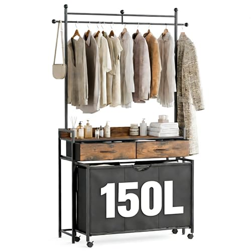 Mondeer Laundry Basket with 3 Compartments, 150L Laundry Sorter with Shelf, Clothes Rack and Drawers, Pull-Out Removable Laundry Bin on Wheels, Rustic Brown and Black