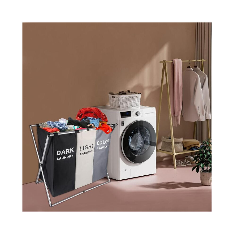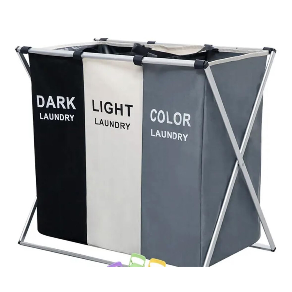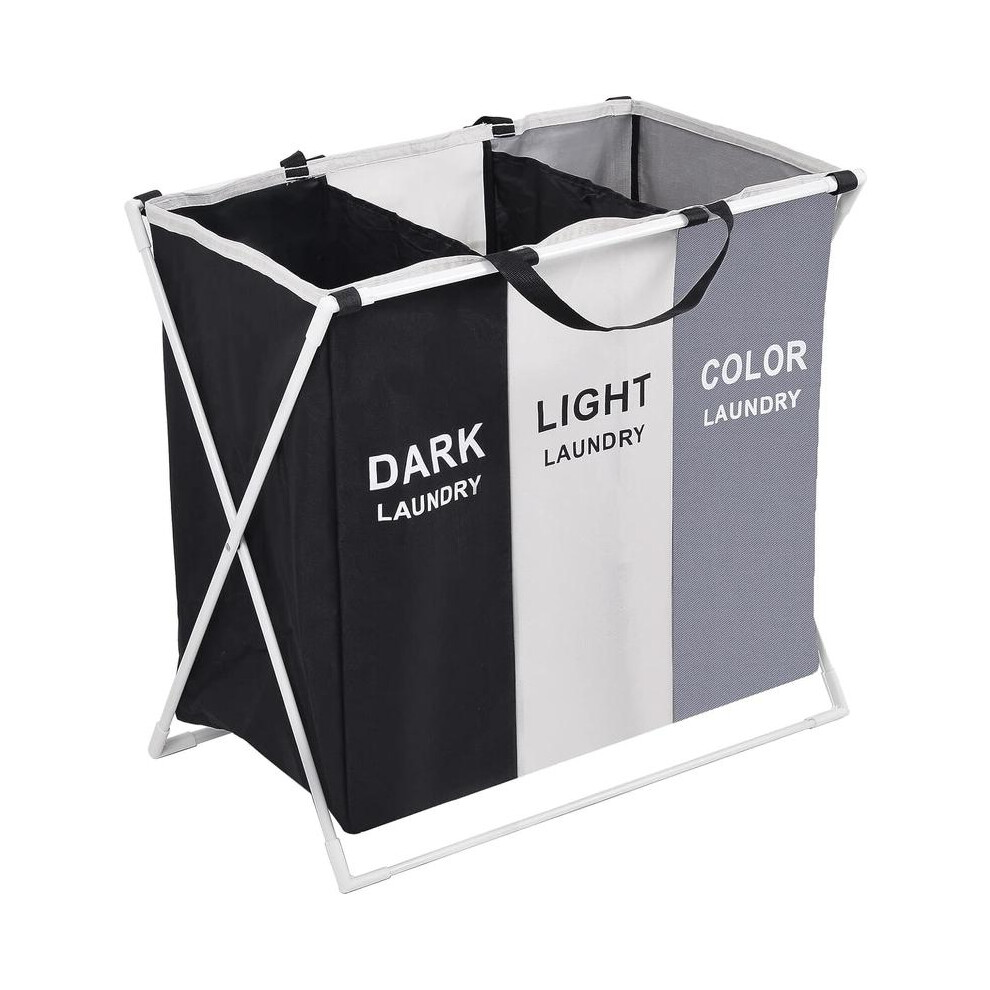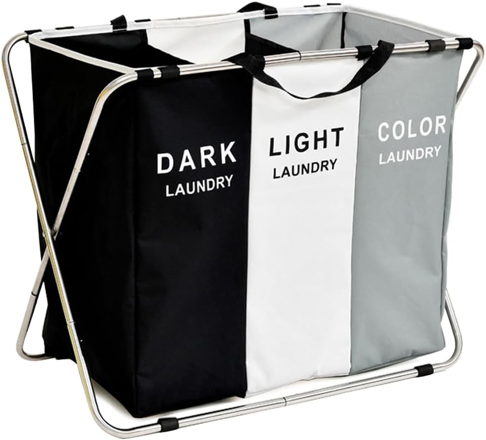 Large Foldable Laundry Basket with 3 Compartments, Stainless Steel Holder, Dirt