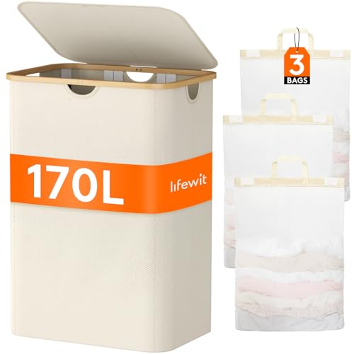 Lifewit 170L Laundry Basket with Lid 3 Compartments, Large Washing Basket with Removable Laundry Bags and Bamboo Handles, Clothes Hampers for Laundry, Bathroom, Bedroom, Dorm, Beige