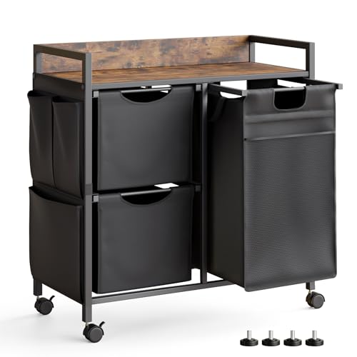 Mondeer Laundry Basket with 3 Compartments, 150L Laundry Sorter with Shelf, Clothes Rack and Drawers, Pull-Out Removable Laundry Bin on Wheels, Rustic Brown and Black