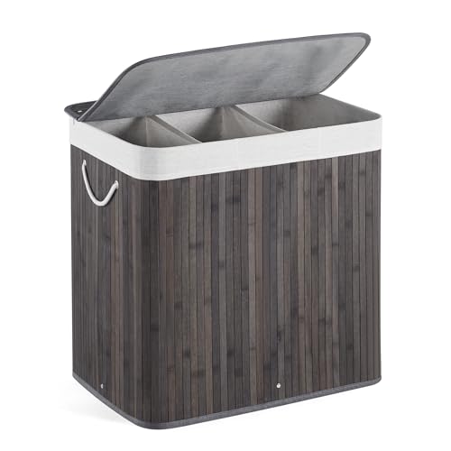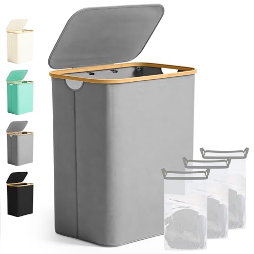 Mondeer Laundry Basket with Lid 150L, 3 Compartments Bamboo Laundry Hamper with Handles Removable Washable Lining, Foldable, for Bedroom Bathroom or Utility Room, 60 x 40 x 61 cm, Light Grey