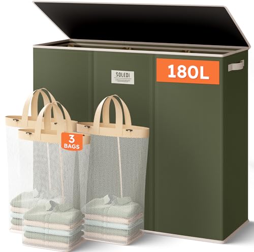 SOLEDI Laundry Basket 3 Compartments 180L Washing Basket with Lid, Clothes Hamper with Removable Laundry Bag, Collapsible Laundry Baskets, Sturdy and Stylish Laundry Bin for Home, Avocado Green