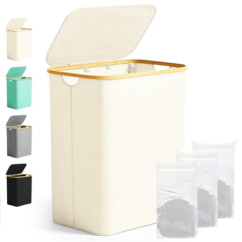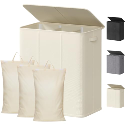 Lifewit 150L Laundry Basket with Lid 3 Compartments, Large Washing Basket with Removable Laundry Bags and Bamboo Handles, Clothes Hampers for Laundry, Bathroom, Bedroom, Dorm, Cream White