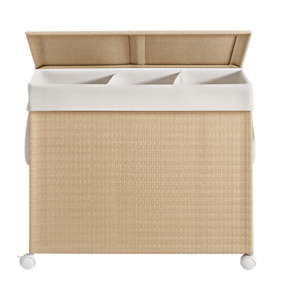 Laundry Basket with 3 Compartments, 140 L Laundry Sorter on Wheels, Clothes Basket with Lid, Removable Liner with Handles, Natural Beige and Matte Whi