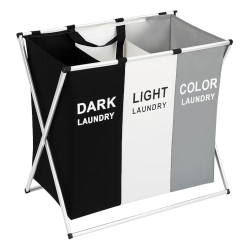 Collapsible Laundry Basket with 3 Compartments and Sturdy Aluminum Frame for Clothes Sorting