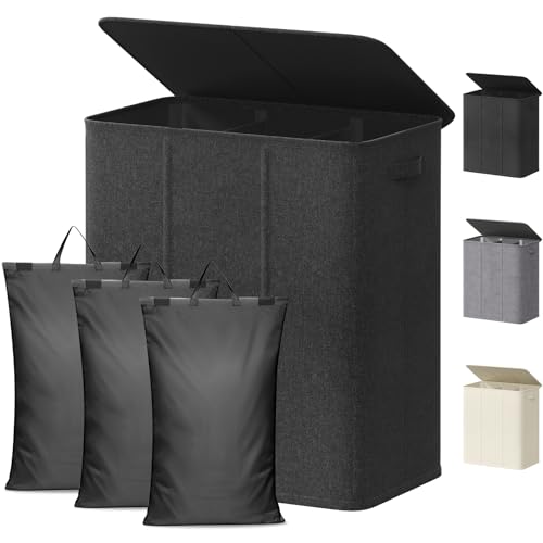 BRIAN & DANY Laundry Basket with Lid, Large Laundry Hamper 3 Compartments with Handles, Collapsible Washing Basket with 3 Removable Bags, Washing Bin for Dirty Clothes, 145L Black