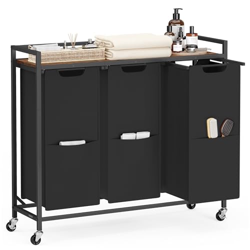 HOOBRO Laundry Basket on Wheels, Laundry Basket 3 Compartments, Laundry Sorter with 2 Non-Woven Drawers, Pull-Out Removable Laundry Bags, 3 x 43.4L, Rustic Brown and Black EBF78XY01