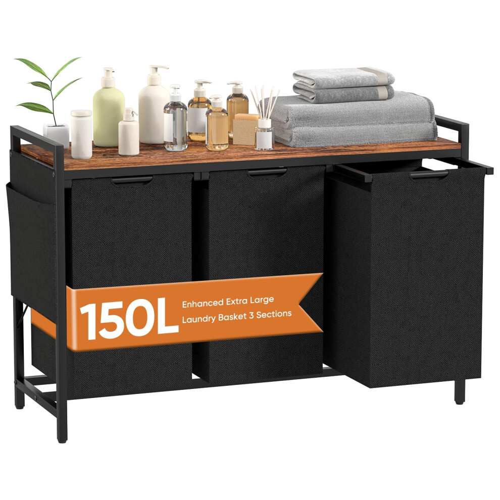 TESSTINA Laundry Basket 3 Compartments, Laundry Hamper with Shelf, Capacity 150 L, Removable Oxford Fabric Liner Bag, Wash Basket with Side Pockets