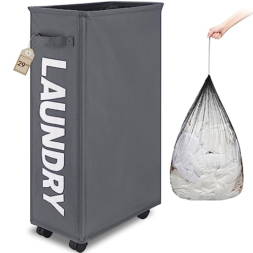 TOTANKI 29" Large Slim Rolling Laundry Basket on Wheels with Removable Bag, Foldable Laundry Hamper with Handle, Collapsible Laundry Sorter and Organizer, Tall Storage Basket Bin (Grey)