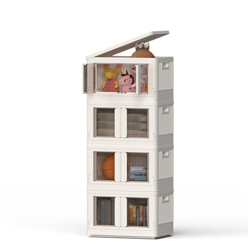 FLEXISPOT 72L*4 Storage Boxes with Lids, Foldable Plastic Containers, Space-Saving Organiser Boxes, Collapsible Laundry Baskets, Compact Stacking Crates for Home Storage,Milk