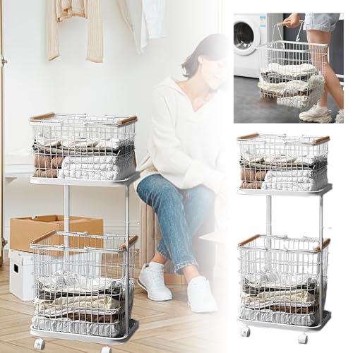 2 Tier Rolling Laundry Basket, Movable Dirty Clothes Hamper with Wheels, with 2 Detachable Removable Metal Wire Laundry Basket, for Easy Transport and Storage in Laundry Room, Bathroom, Bedroom