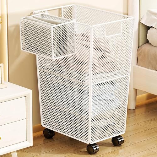 Iron laundry basket with universal wheels, laundry basket with small storage basket, metal mesh laundry cart for small spaces