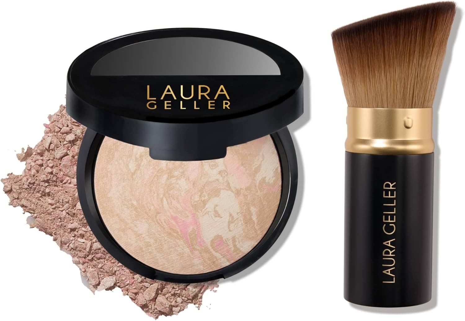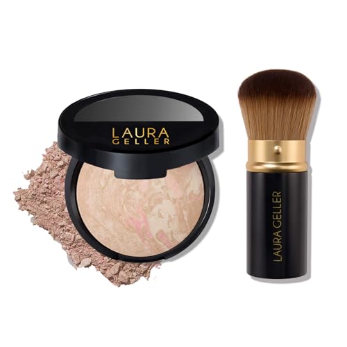 LAURA GELLER NEW YORK Blush-n-Balance 3pc Kit Baked Balance-N-Brighten Color Correcting Foundation, Medium + Retractable Kabuki Brush + Baked Blush-N-