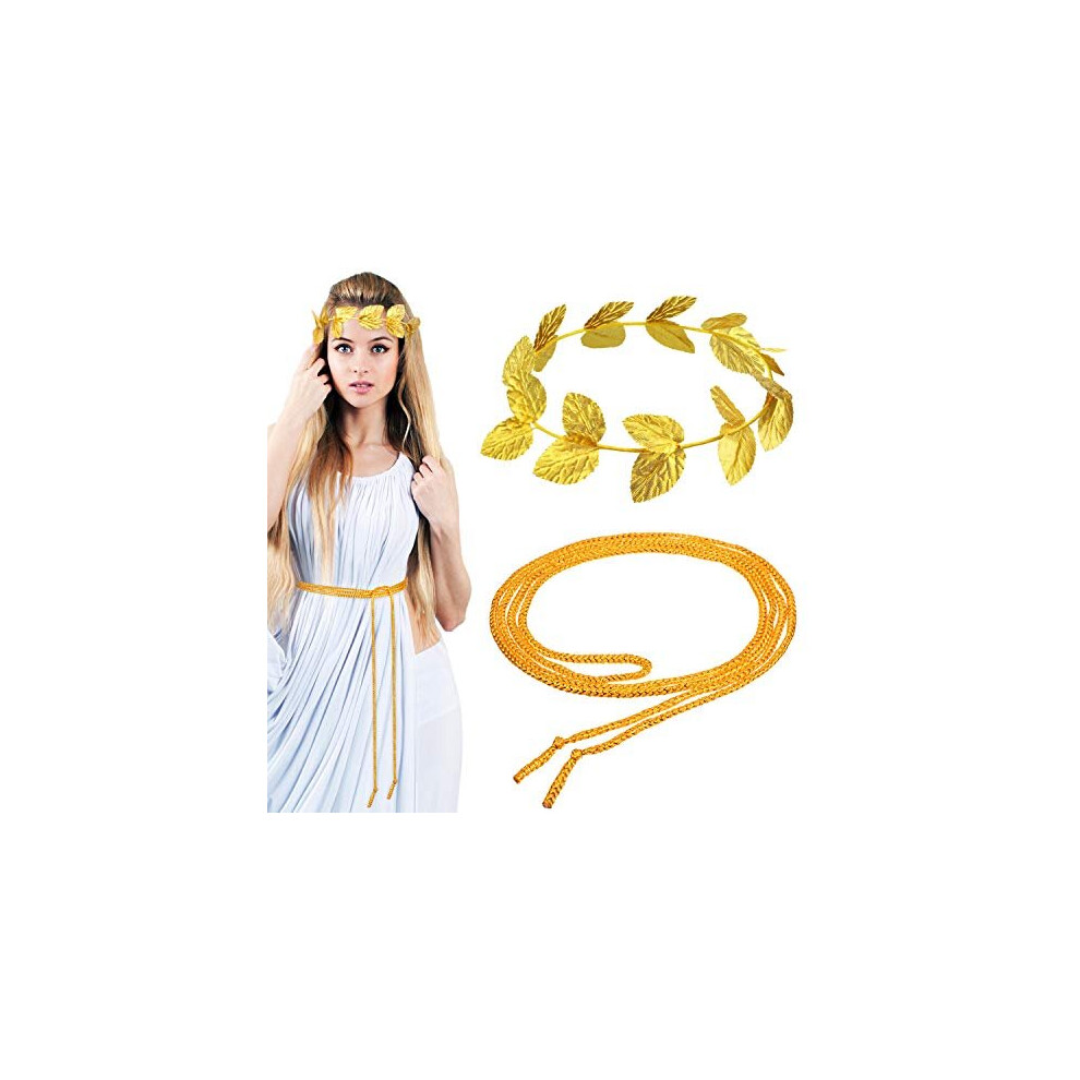 2 Pieces Roman Laurel, Roman Head Wreath Leaf Crown Headdress with 2 Pieces Roman Rope Belt, Gold