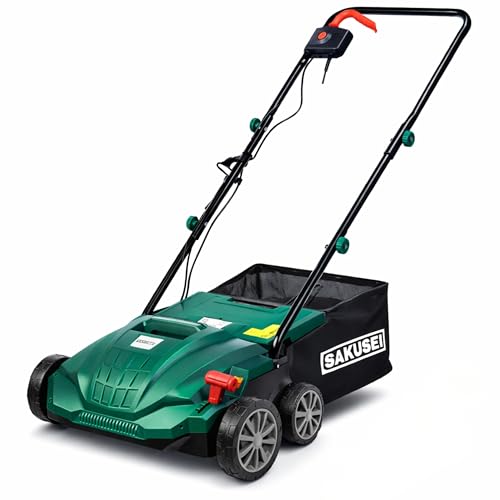 SAKUSEI Tools Electric Lawn Scarifier/Rake/Aerator 1500w Dethatching Grass Racking, Moss Dead Leave Removal, Soil Aerater, 30 Litre Collection Bag, 10m Power Cable, 4 Cutting heights, 32cm Width.