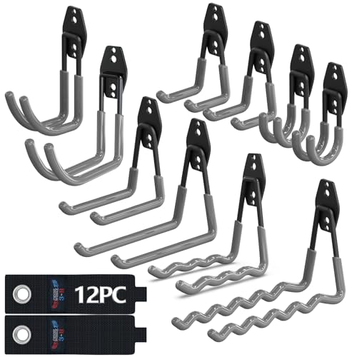 3-H Heavy Duty Garage Hooks 12 Pack, Utility All-Steel Storage Hooks with Anti-Slip Coating, Wall Mount Hooks for Hanging Ladders, Lawn Mower, Hose, Garden Tools (Grey)