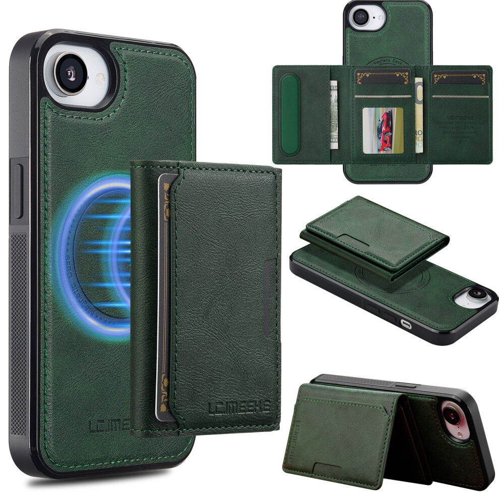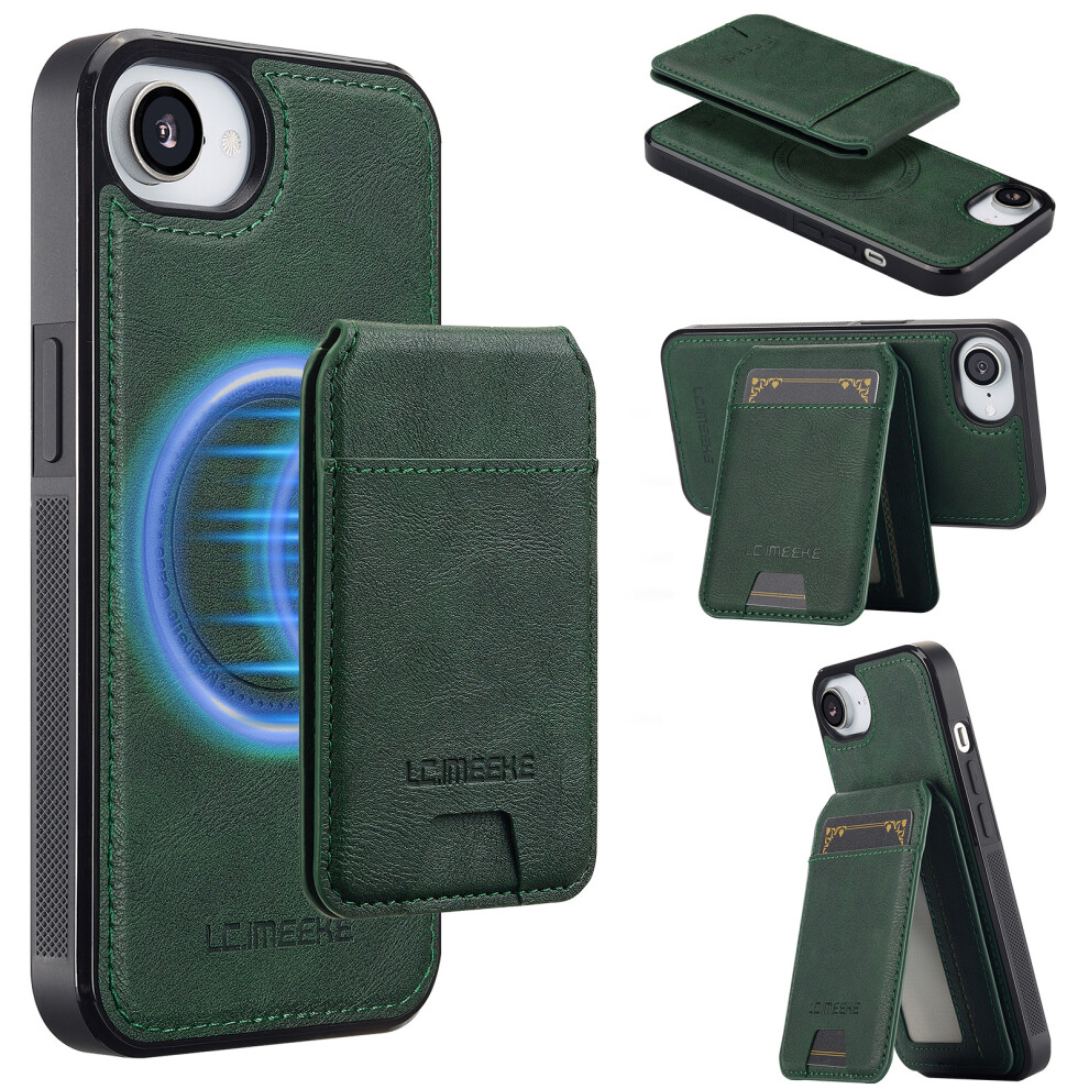 (iPhone 16e, Green) LC.IMEEKE L3 For iPhone 16e Magnetic Case Detachable Card Holder Leather TPU Mobile Cover