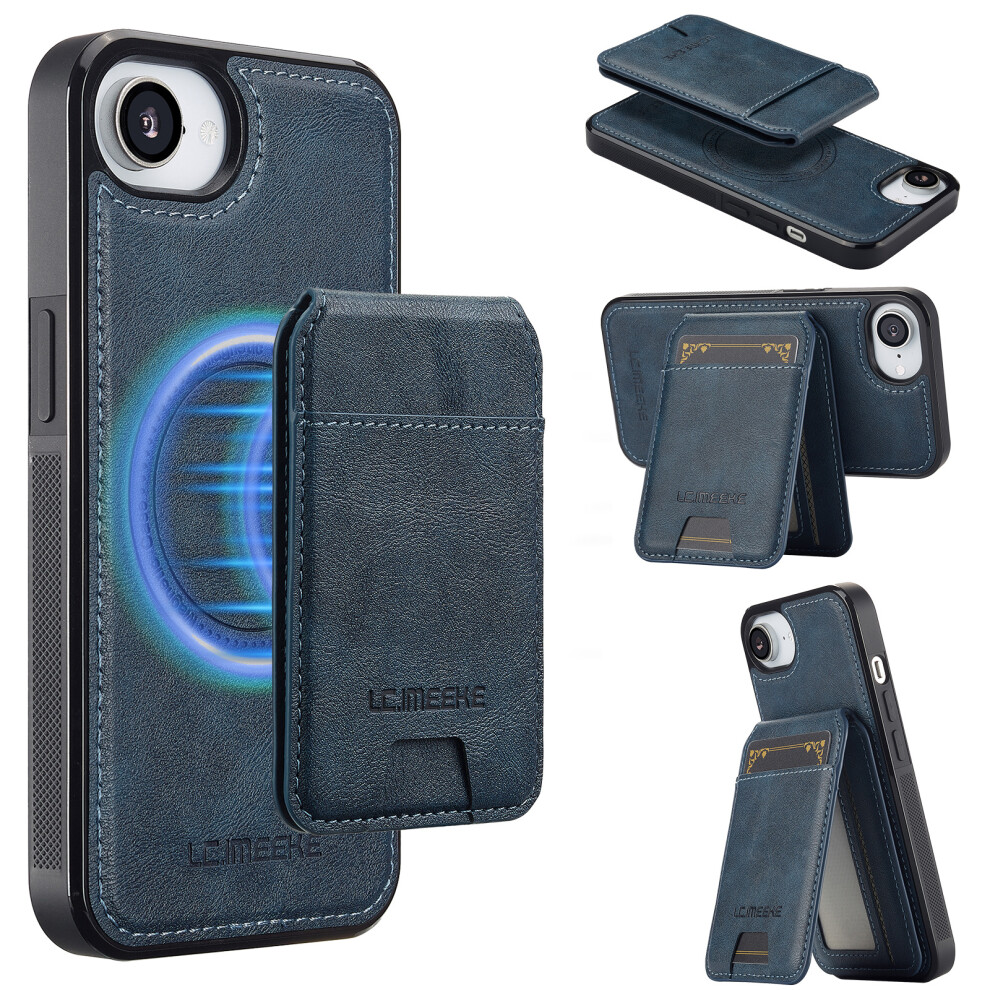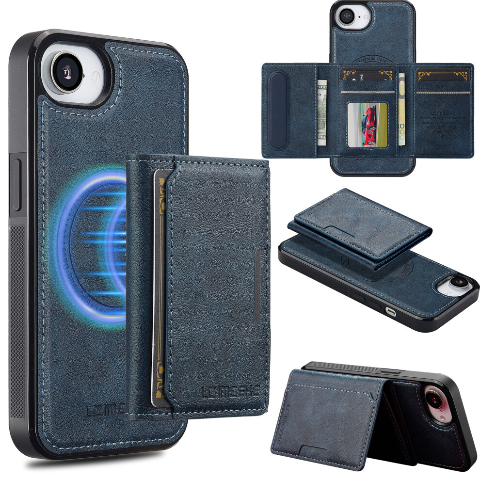 (iPhone 16e, Blue) LC.IMEEKE L3 For iPhone 16e Magnetic Case Detachable Card Holder Leather TPU Mobile Cover