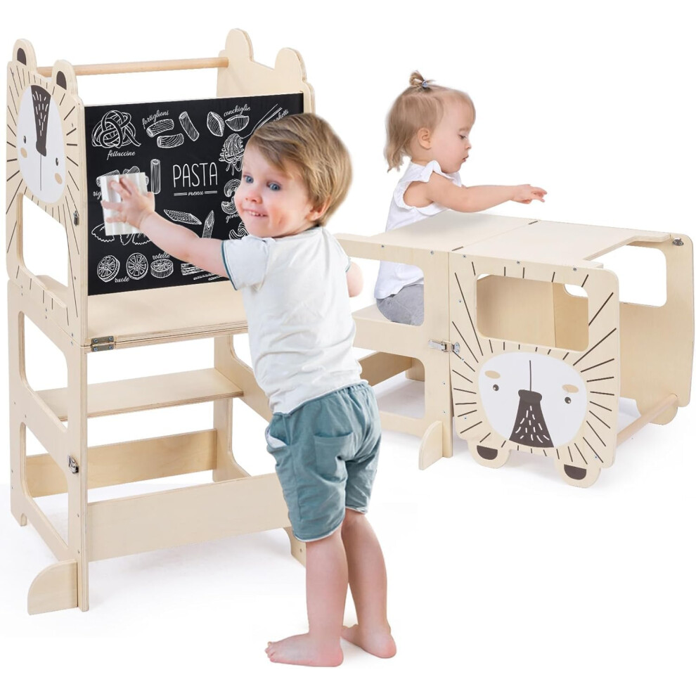 Kids Step Stool, Kitchen Stool Aid for Toddlers Wooden Learning Standing Tower with Chalkboard Foldable Toddler Table and Chair Set 2 in 1 Helper Standing Tower for 18 Months (lion)