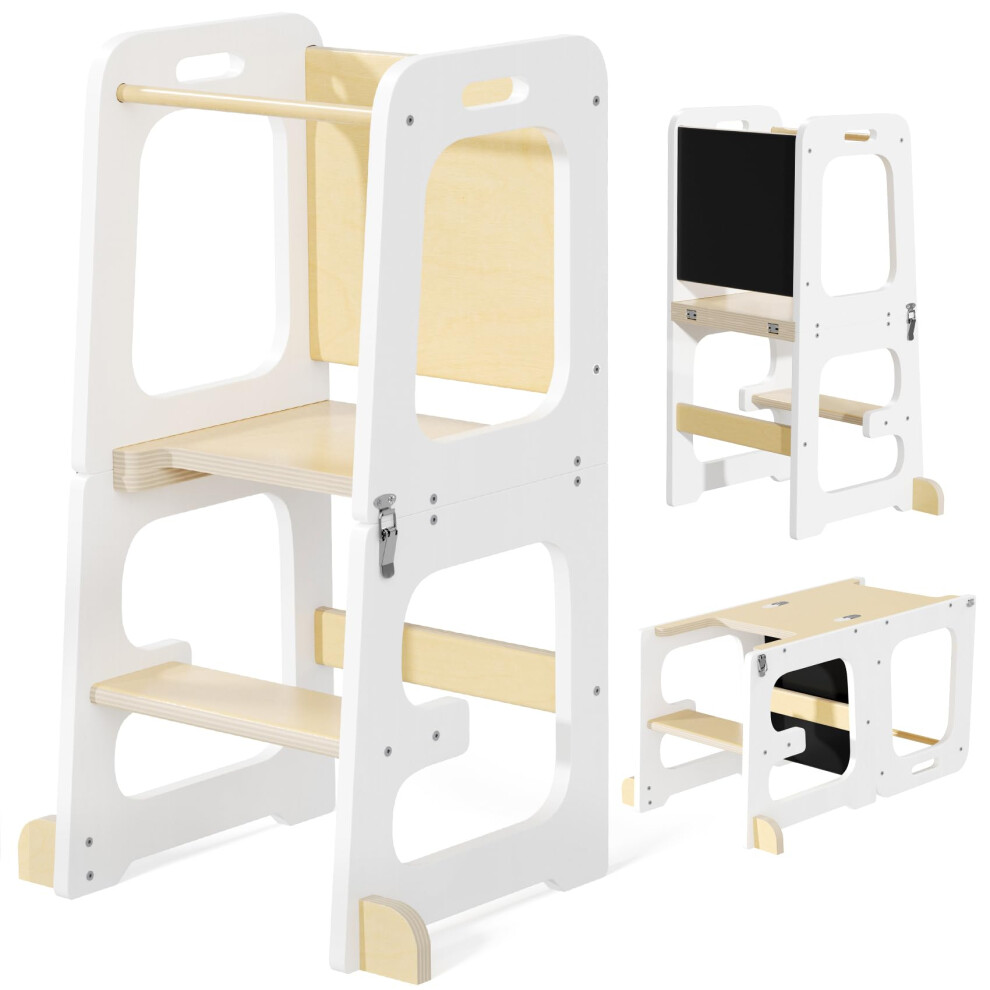 KIDINIX Foldable Learning Tower, Height Adjustable Toddler Step Ladder with Safety Rails, Wooden Kitchen Tower with Blackboard for Kids 1-6 Years, Safety Design and Space saving, Natural & White