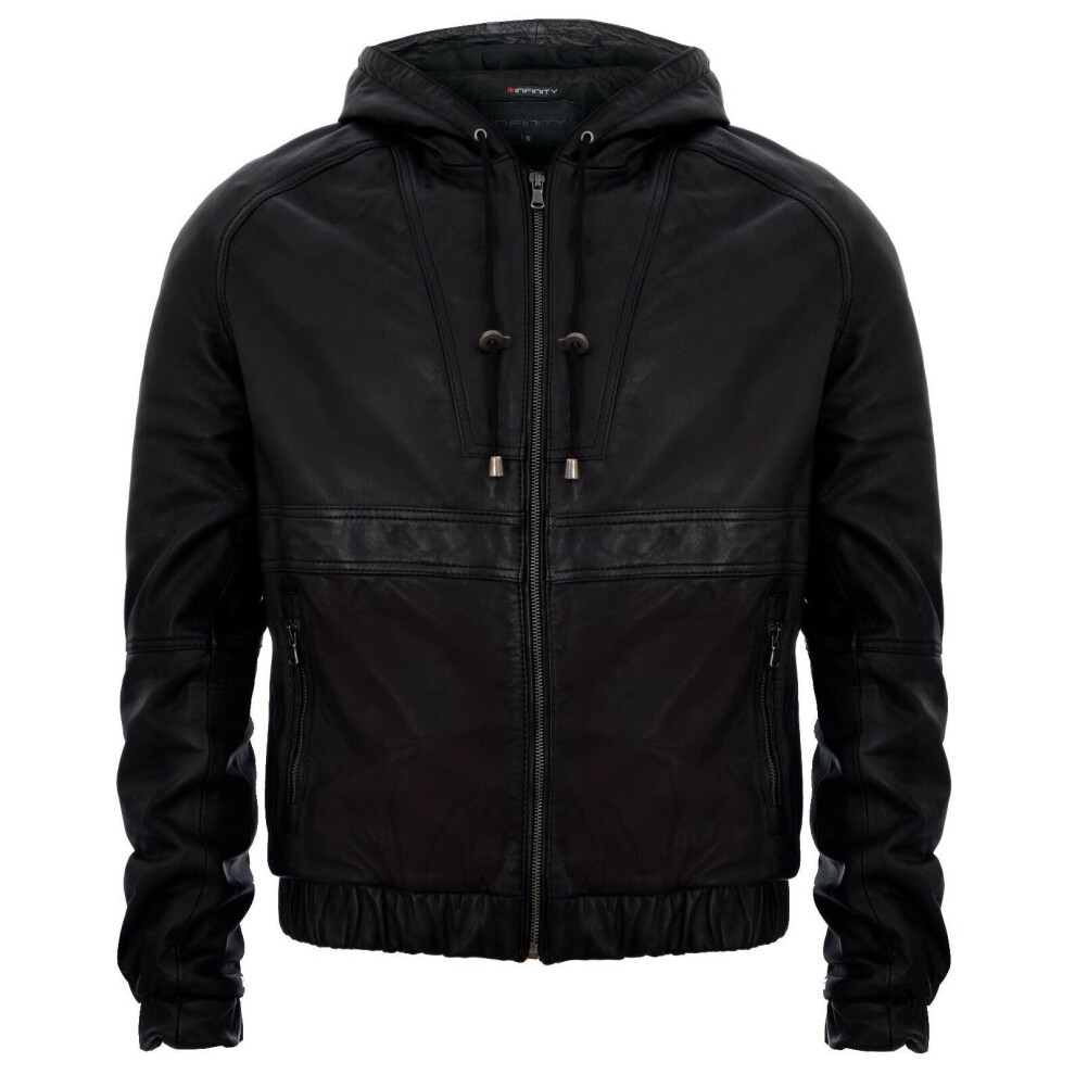 Mens Real Leather Bomber Jacket Trendy Removable Hood Style Reggie (UK, Alpha, 3XL, Regular, Regular, Black)