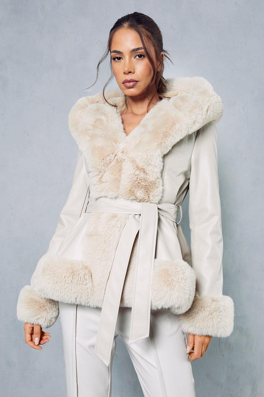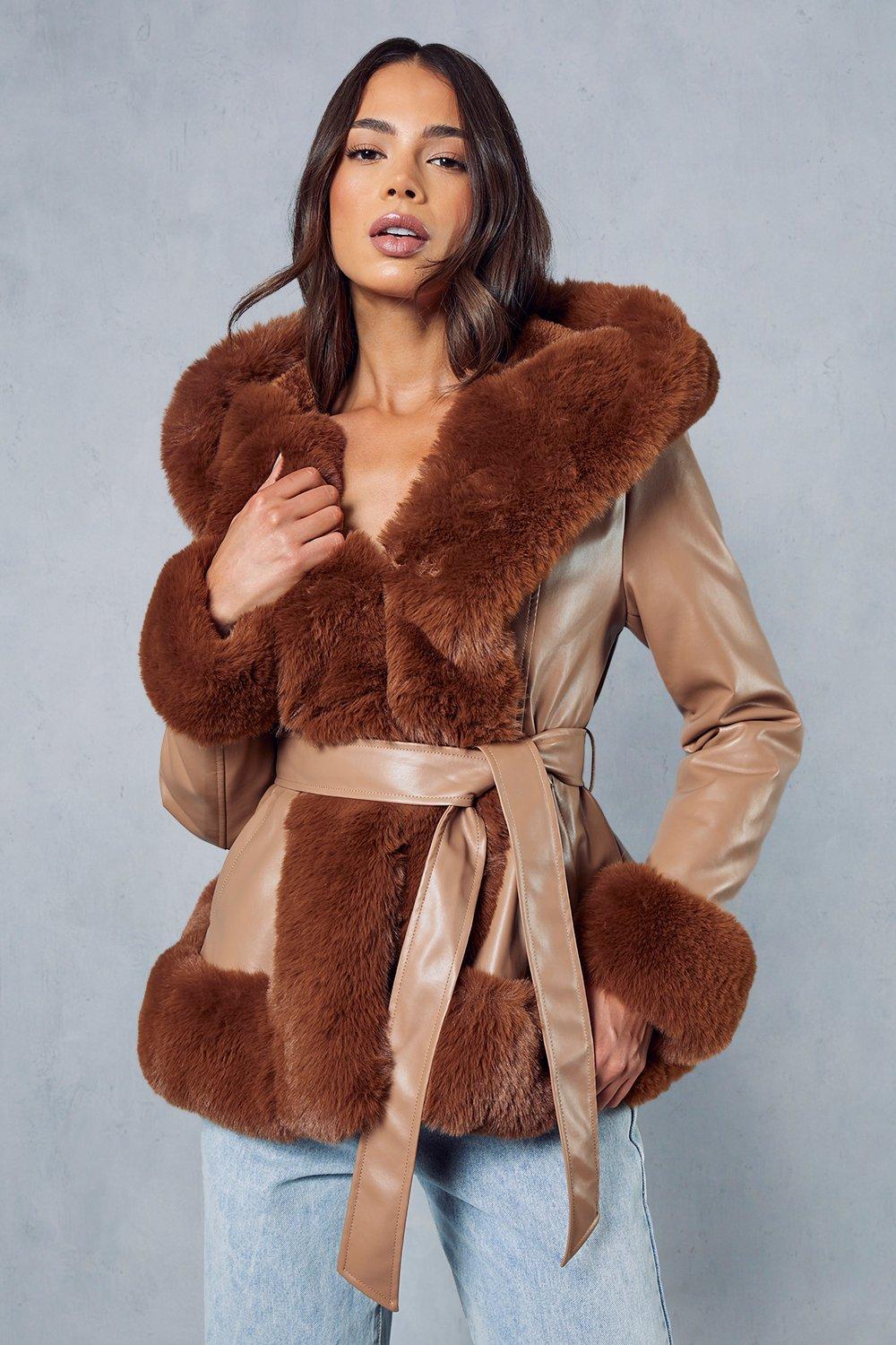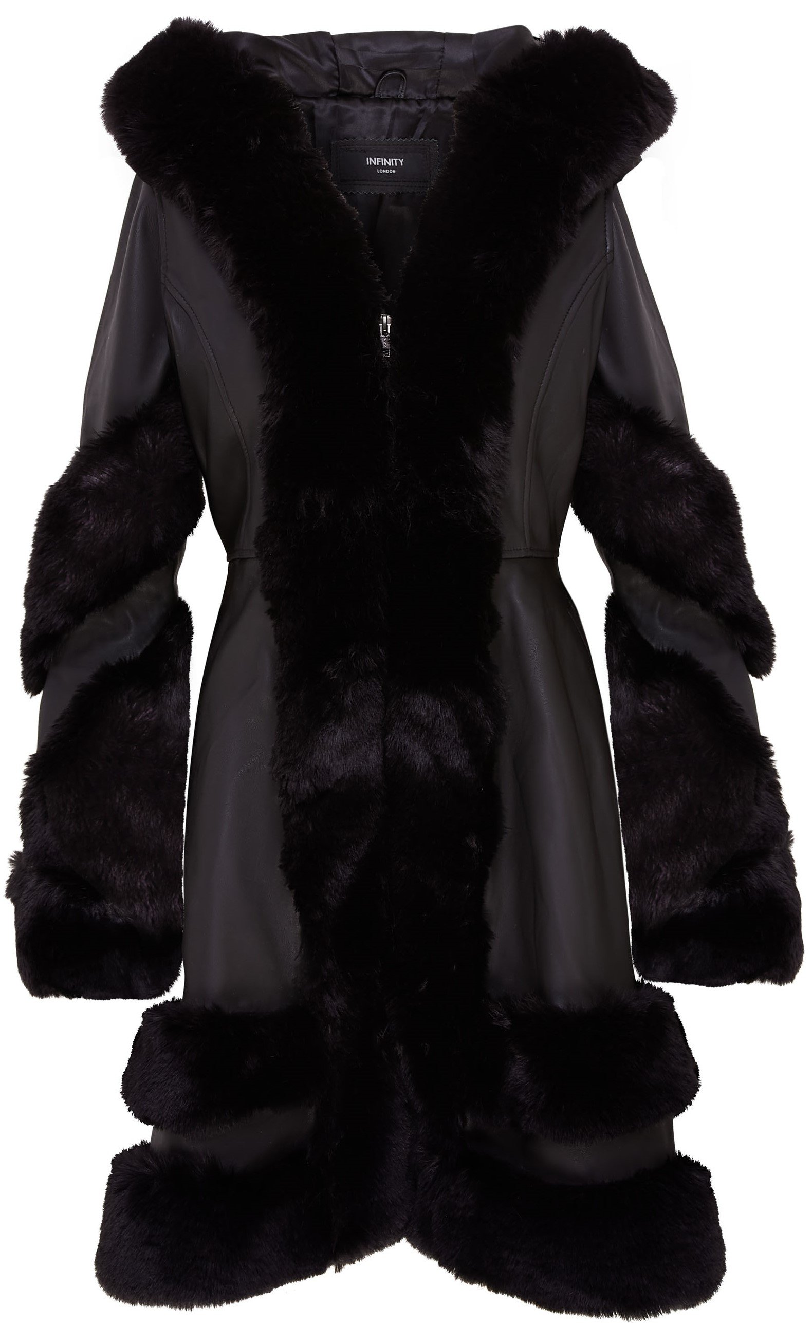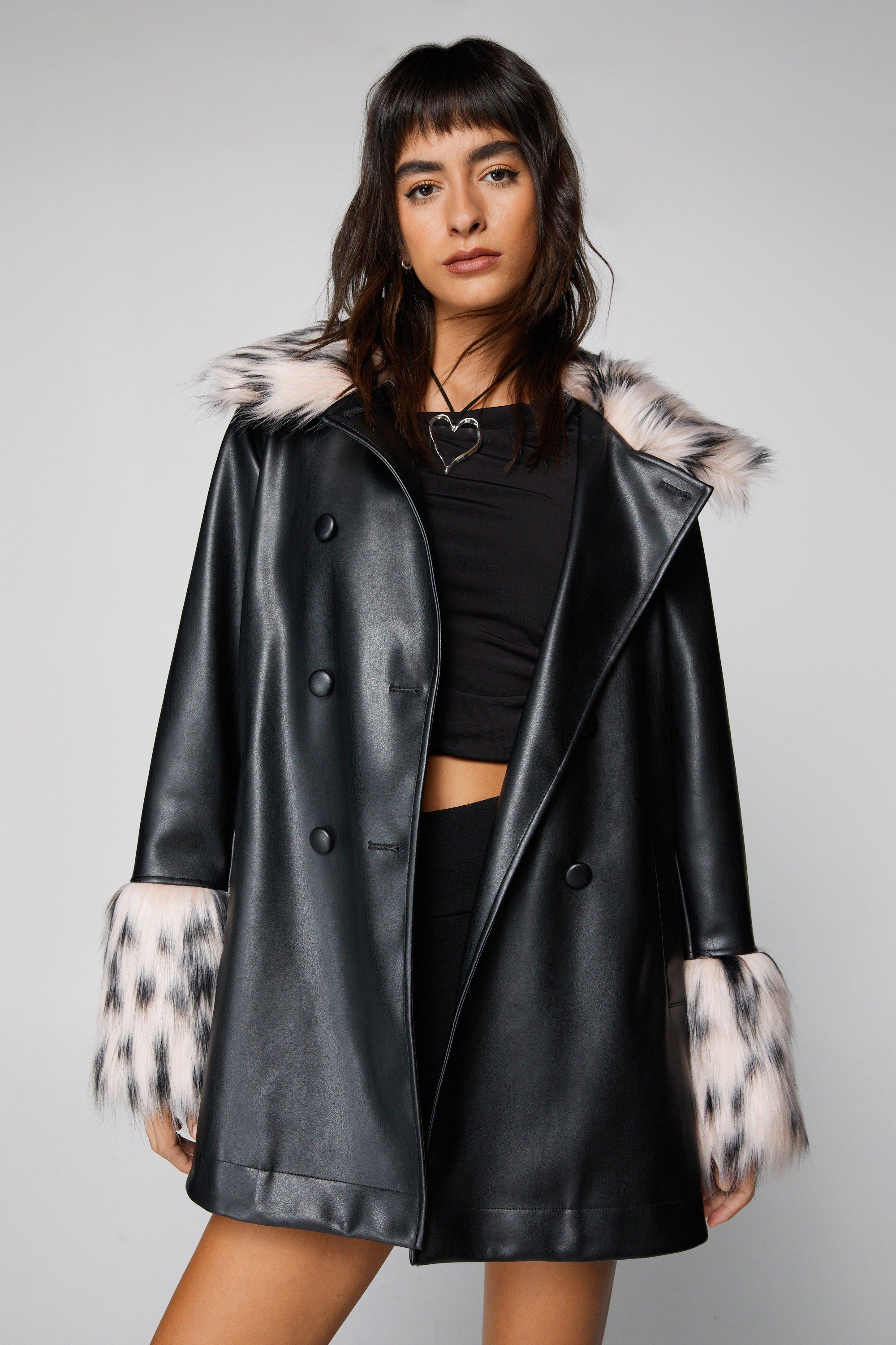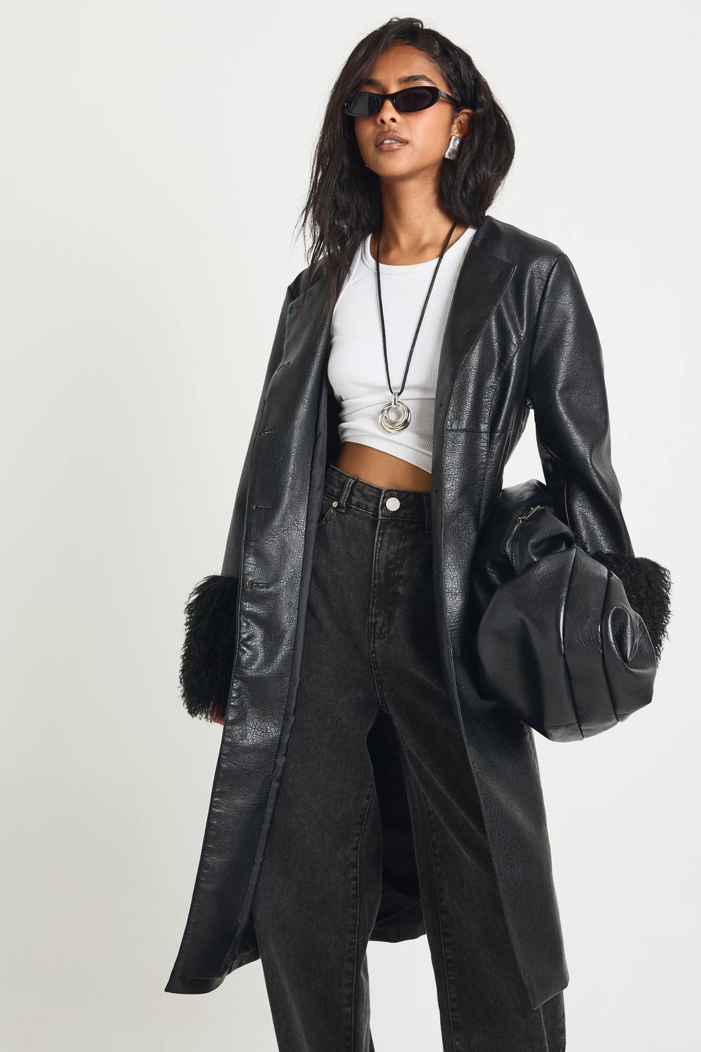 Premium Faux Leather Faux Fur Detail Longline Coat
