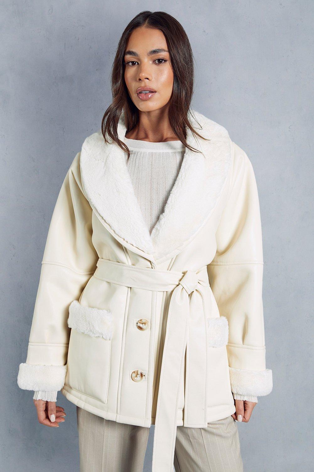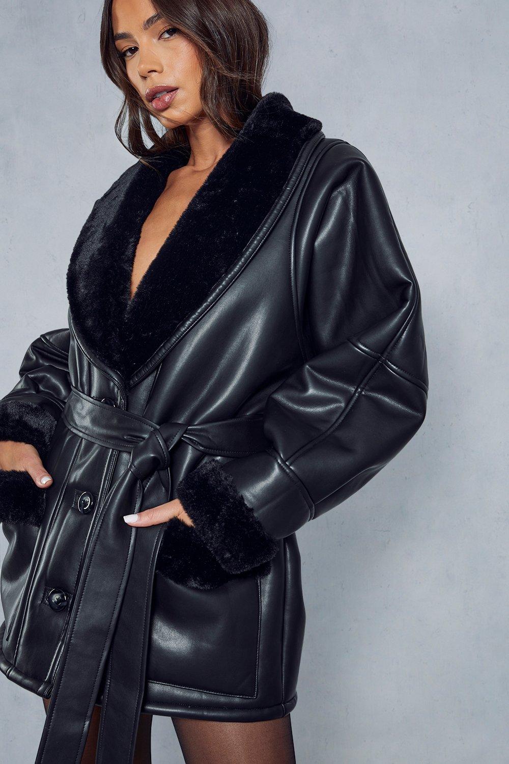 Premium Leather Look Belted Fur Lined Aviator Coat