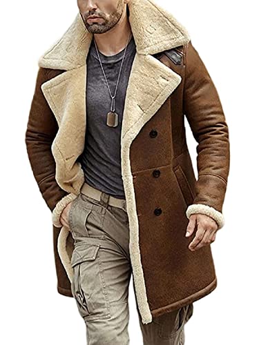 Winter Brown Real Leather Jacket -Mens High Collar Biker Jacket Fluff Lining Coat Winter Warm Outwear - Shearling Faux Fur Flight Aviator Natural