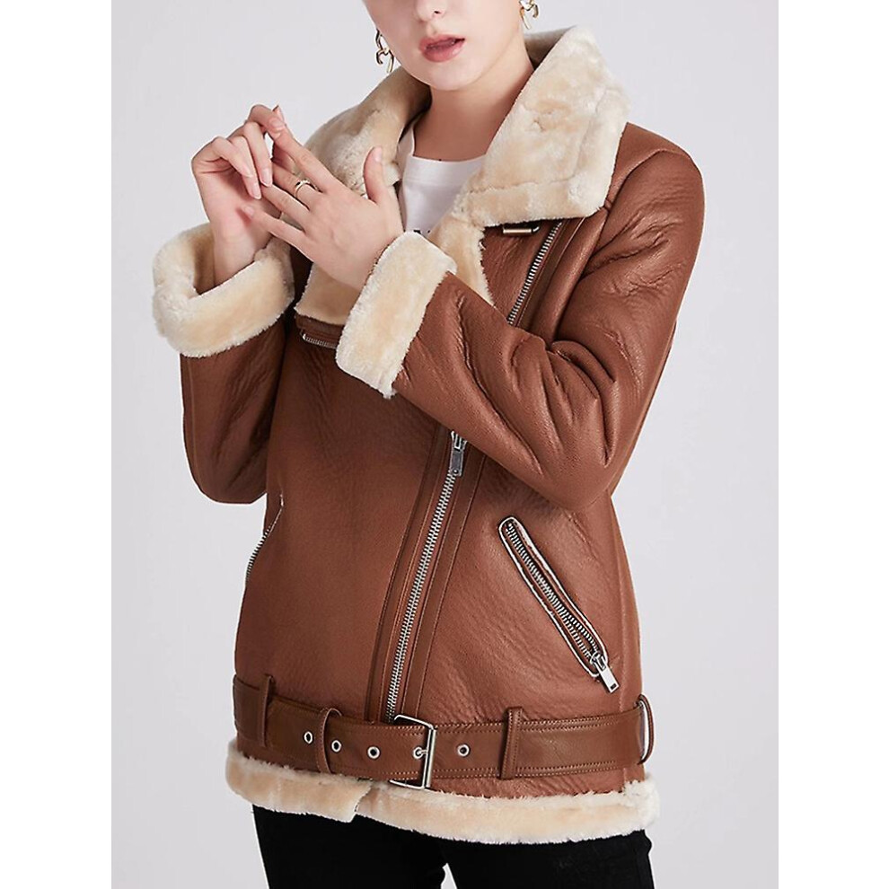(Brown, M) Winter Coats Women Thick Faux Leather Fur Sheepskin Coat Female Fur Leather Jacket Aviator Jacket