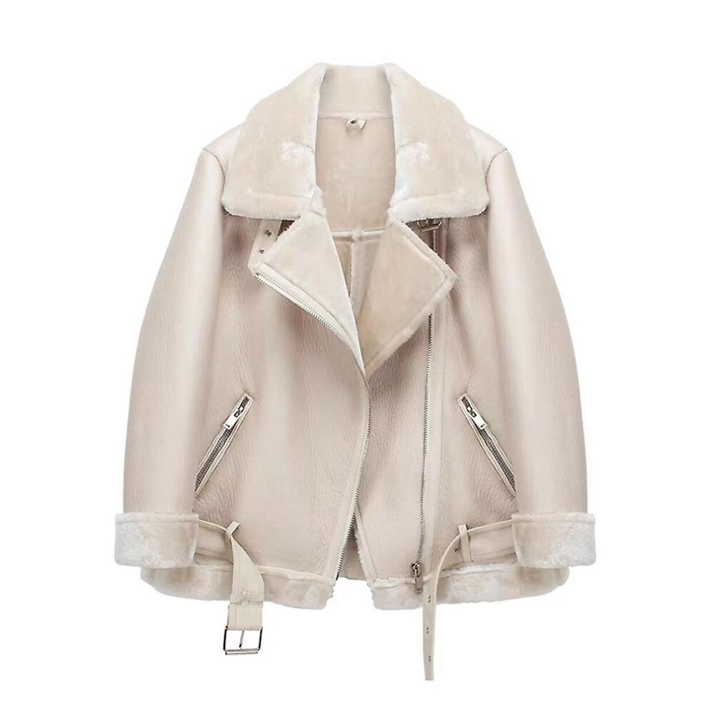 (Beige, M) Winter Coats Women Thick Faux Leather Fur Sheepskin Coat Female Fur Leather Jacket Aviator Jacket