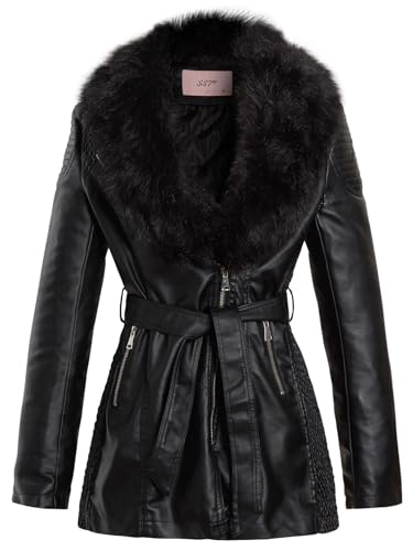 Women Winter Faux Fur Leather Jacket Short Biker Coat with Belt Warm