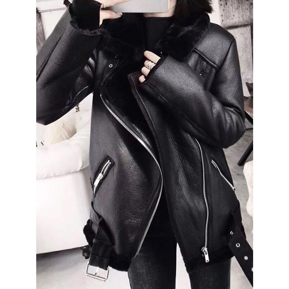 (Black, M) Winter Coats Women Thick Faux Leather Fur Sheepskin Coat Female Fur Leather Jacket Aviator Jacket