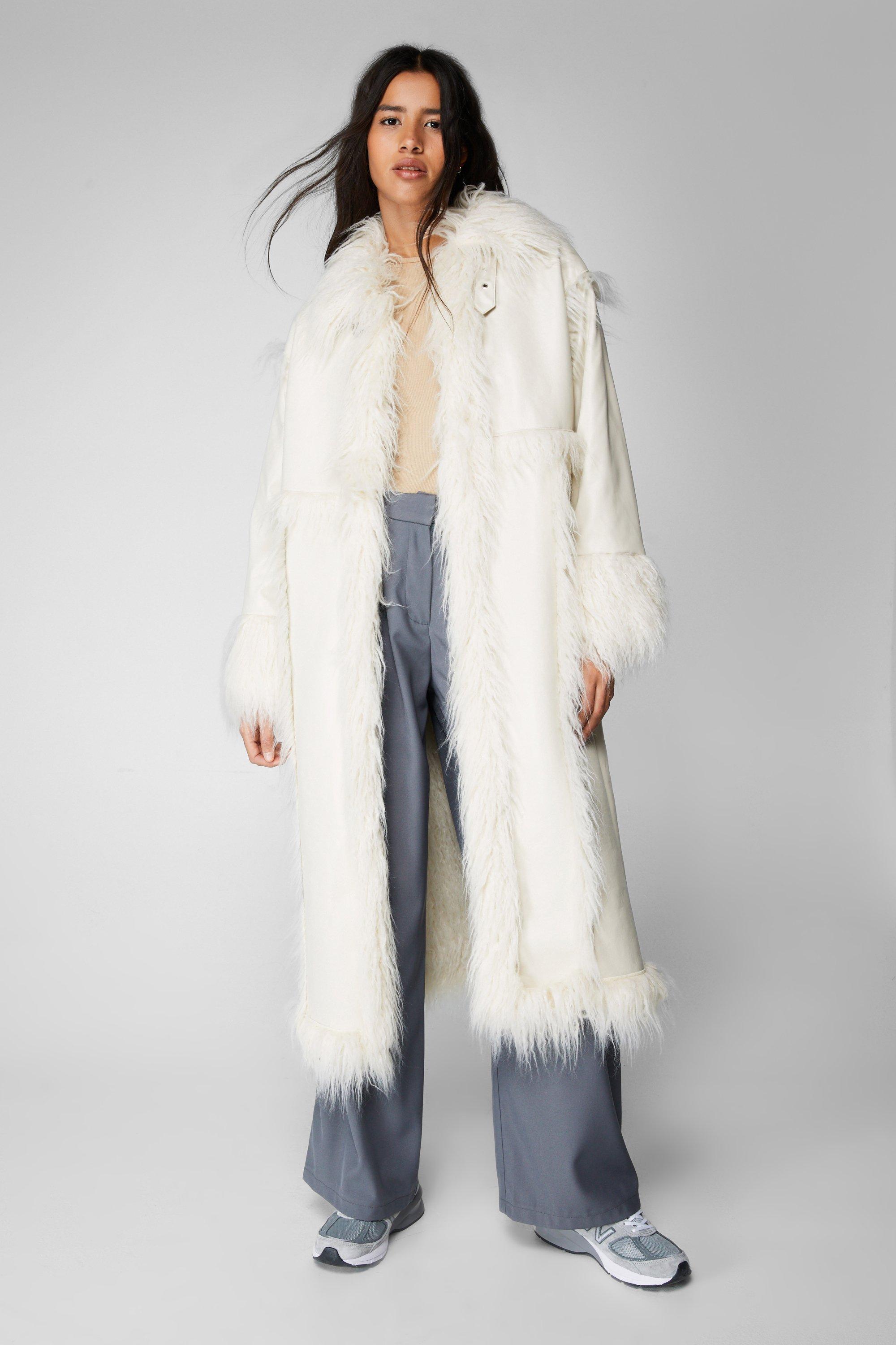 Faux Leather Shearling Fur Trim Longline Afghan Coat