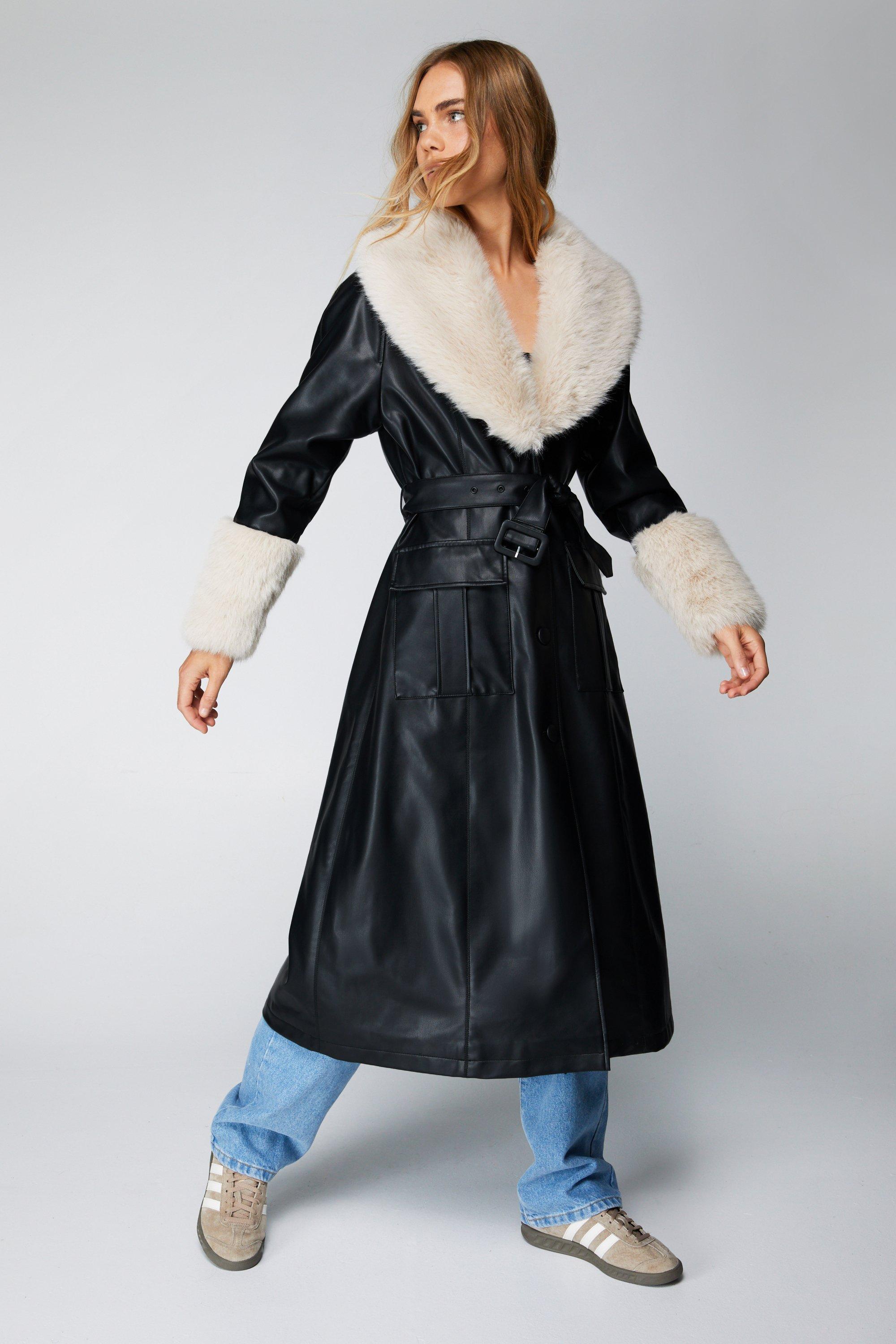 Womens Faux Leather Trench Coat With Fur Cuffs - Black - 16, Black