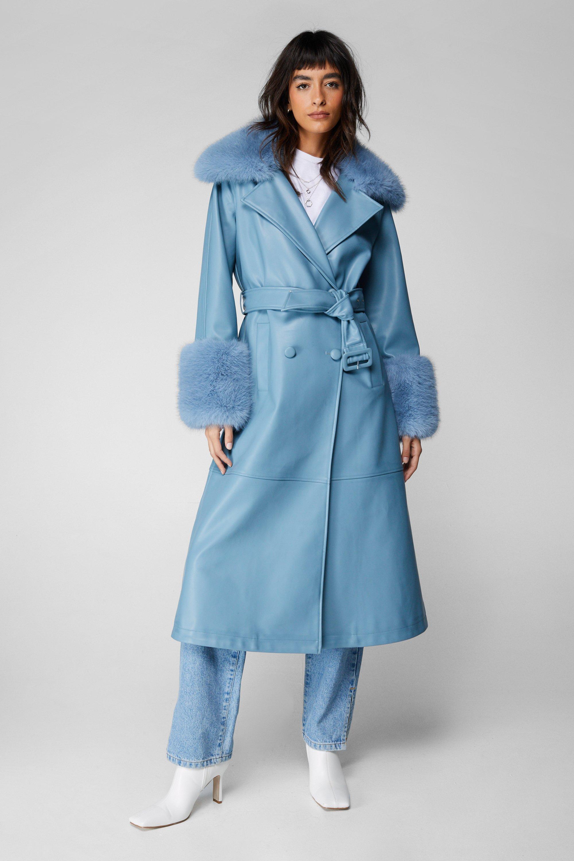 Womens Faux Leather Trench Coat With Fur Cuffs - Black - 10, Black