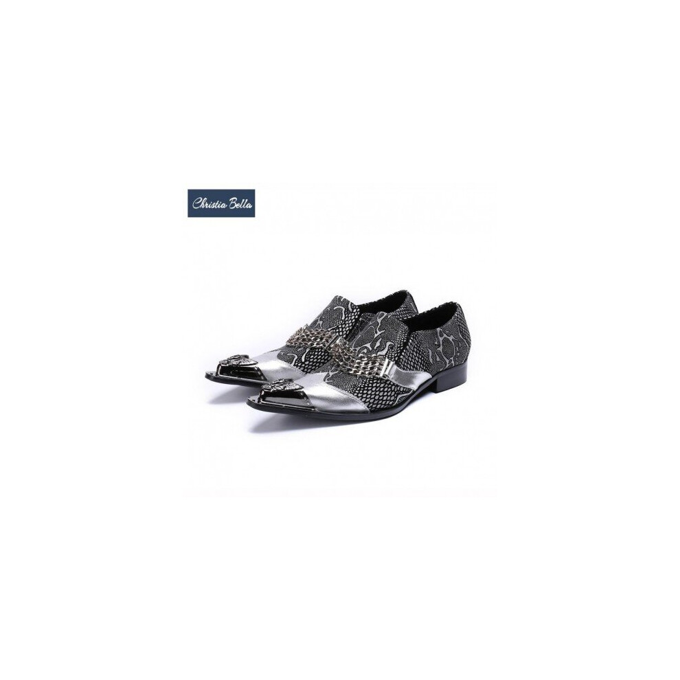 (Silver) Christia Bella Designer Chains Men Dress Shoes Wedding Party Formal Shoes Silver Genuine Leather Business Shoes Male Plus Size