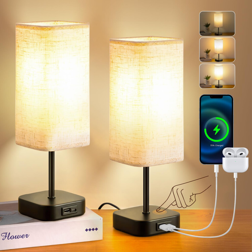 YMEP Bedside Table Lamp Touch Control Dimmable, Charging LED Bedroom Living Room Lamps Dimmer USB A+C Port Charger 2 Pack Includes 2 E27 Bulbs