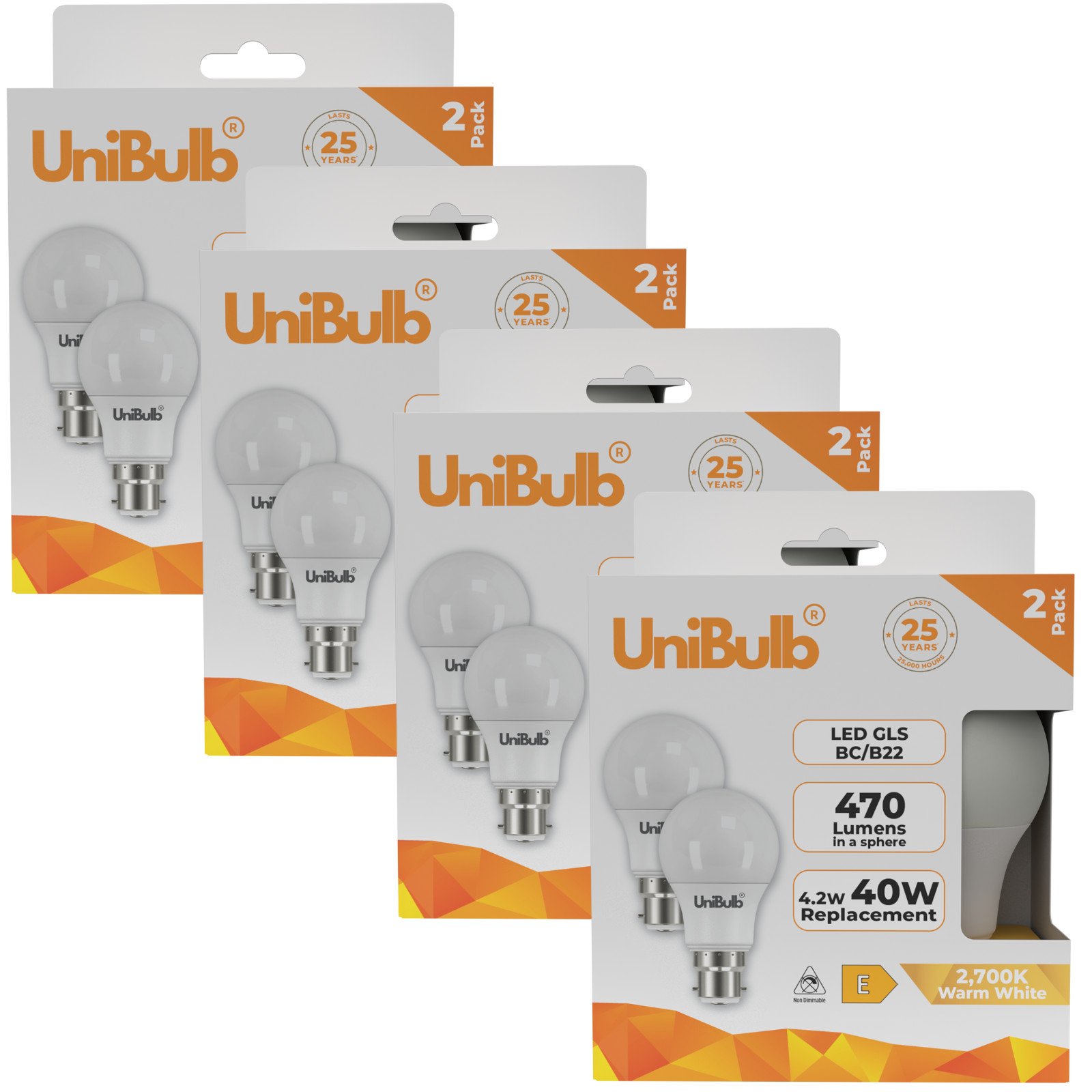 4 Pack UniBulb GLS B22 LED Bayonet Bulbs Warm White for Hallway Fixtures