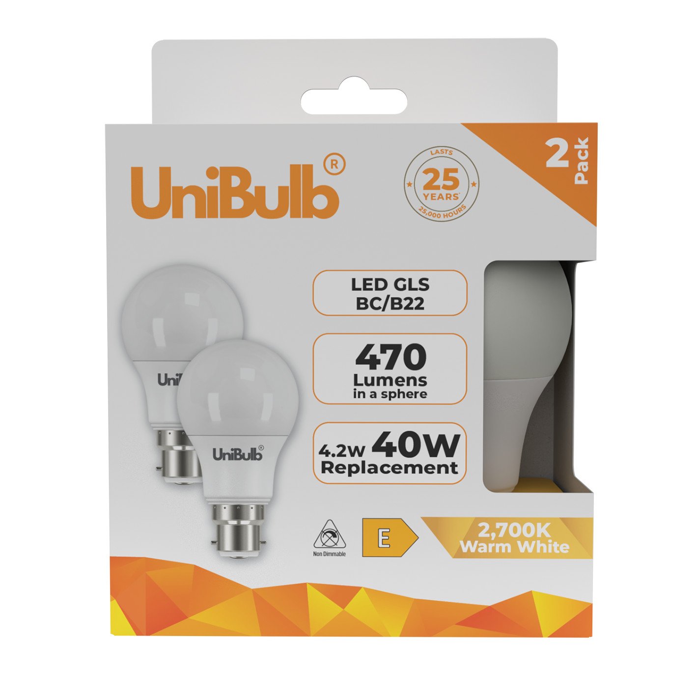 2 Pack UniBulb GLS B22 LED Bayonet Bulbs Warm White for Hallway Fixtures